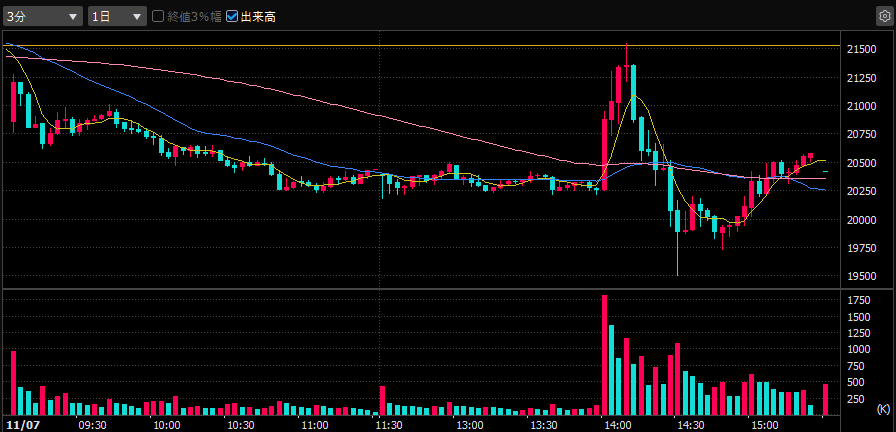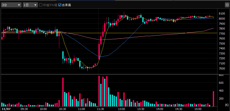 | ニデック | 1400 | 最後に下がって利益減少 ただ予想通り後場に上昇 |
